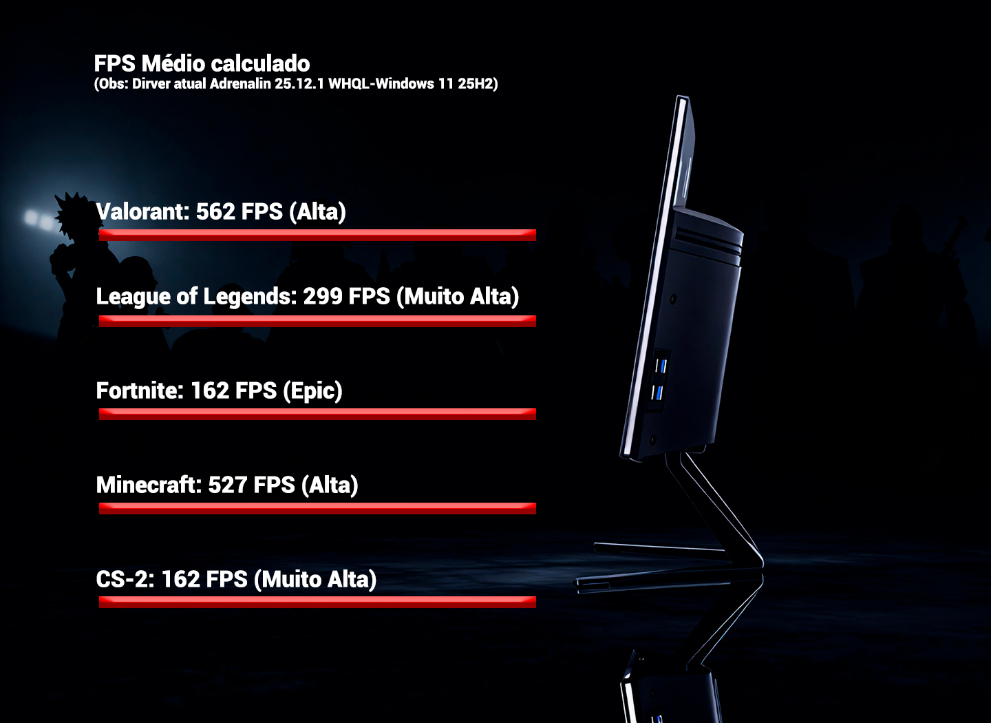 - Gabinete: All-in-One com tela curva integrada de 27", resolução 1440P QHD e 165Hz de taxa de atualização.