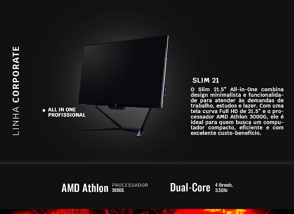 O Slim 21.5” All-in-One combina design minimalista e funcionalidade para atender às demandas de trabalho, estudos e lazer. Com uma tela curva Full HD de 21.5” e o processador AMD Athlon 3000G, ele é ideal para quem busca um computador compacto, eficiente e com excelente custo-benefício.